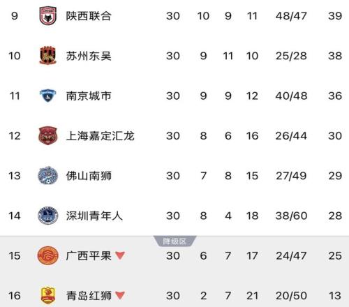 在第30輪比賽開始前,銅梁龍、廣州豹同積57分,排名中甲積分榜第2、3位,兩隊(duì)本賽季正面交鋒時(shí)各贏1場,銅梁龍?jiān)诳蛨鲆?-1大勝廣州豹,主場0-1小負(fù),銅梁龍?jiān)谙嗷?zhàn)績上占優(yōu),因此兩隊(duì)同分的話廣州豹排名靠前。在保級(jí)方面,深圳隊(duì)跟廣西隊(duì)同為25分,廣西主場3-2擊敗深圳,客場0-2失利,同分深圳隊(duì)占優(yōu)。